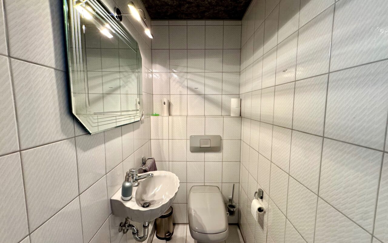Bereits beim Betreten empfängt Sie ein heller, einladender Flur, von dem aus alle Räume der unteren Etage zugänglich sind. Hier befinden sich ein Gäste-WC, ein gut geschnittenes Schlafzimmer, ein Badezimmer mit Doppelwaschtisch und Badewanne, eine separate Küche sowie das lichtdurchflutete Wohnzimmer mit Zugang zum Balkon. Dieser bietet einen angenehmen Blick ins Grüne und lädt zu erholsamen Stunden im Freien ein.